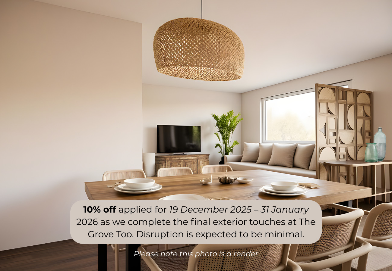 A note for our guests: The Grove Too is complete, but the finishing work for the internal commercial spaces on the ground floor will be finalised over the next few weeks. There will also be some light, non-disruptive finishing work taking place at the rooftop pool bar, though this is not expected to create any noise or impact guest enjoyment. We expect very little disturbance overall, and there will be no noise on public holidays over the Christmas period. As a thank you for your understanding while we add the final touches to our beautiful new community, we are offering a 10% reduced rate from 19 December 2025 to 31 January 2026.