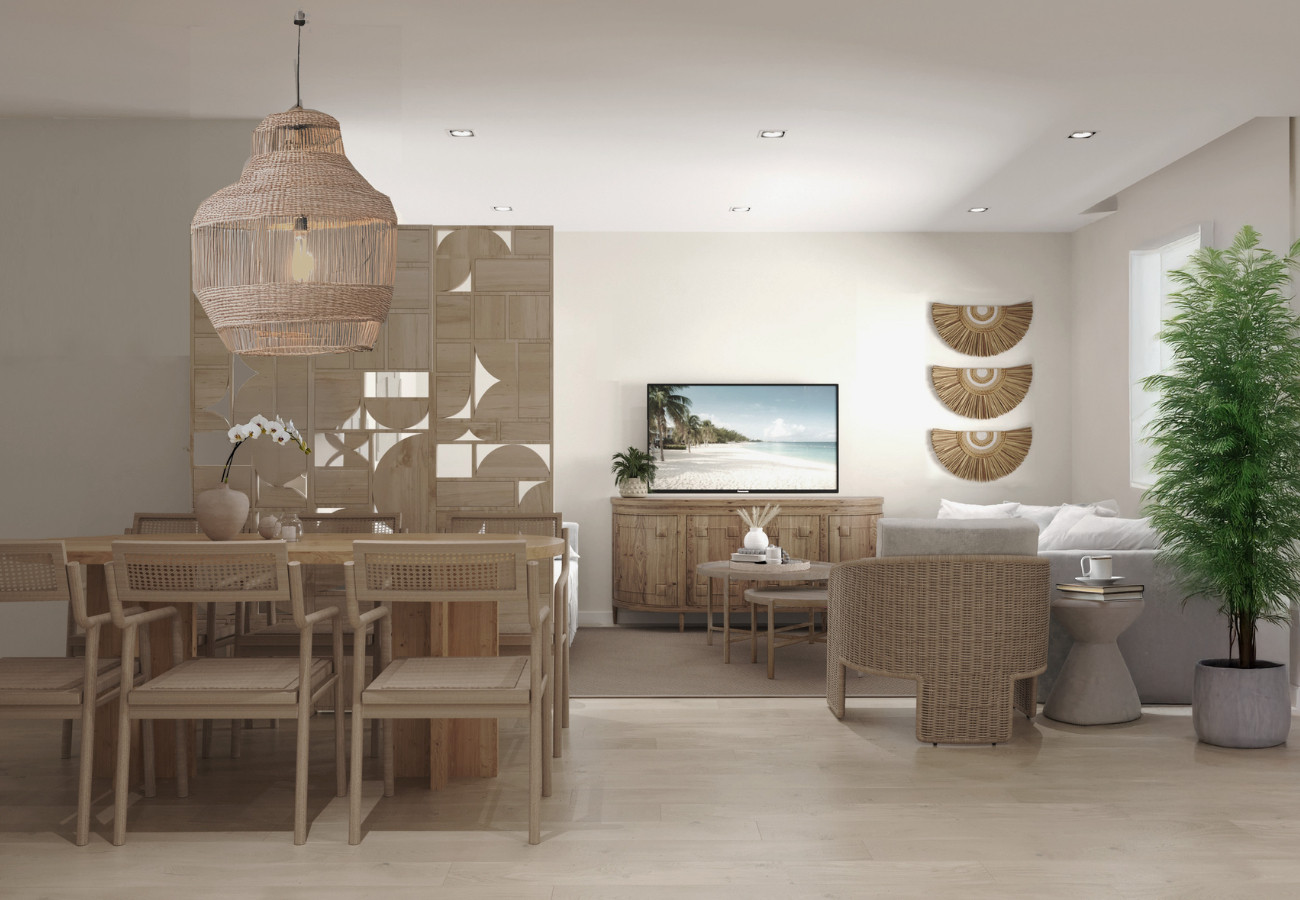 This modern apartment has been designed in collaboration with a Spanish interior designer, blending Mediterranean elegance with Caribbean charm to create a space that feels both sophisticated and effortlessly relaxed.