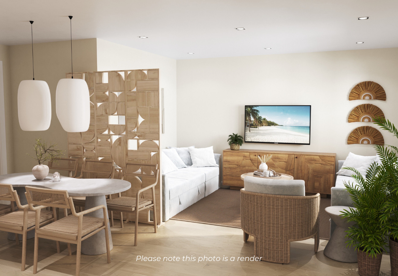 This modern apartment has been designed in collaboration with a Spanish interior designer, blending Mediterranean elegance with Caribbean charm to create a space that feels both sophisticated and effortlessly relaxed.